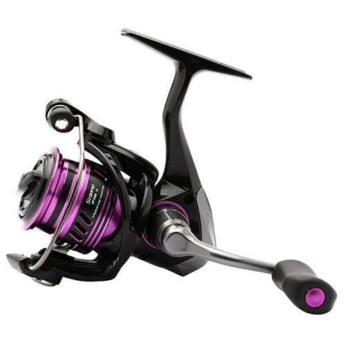 Carrete Scorpio para Spinning. Con cuerpo de grafito resistente a la corrosión. Exclusiva pintura metálica negra y púrpura y 4 rodamientos a bolas + 1 rodamiento de rodillos.Con sistema antirretroceso infinito Quick Sety Rotor Cyclonic Flow.Bobina de aluminio mecanizado.