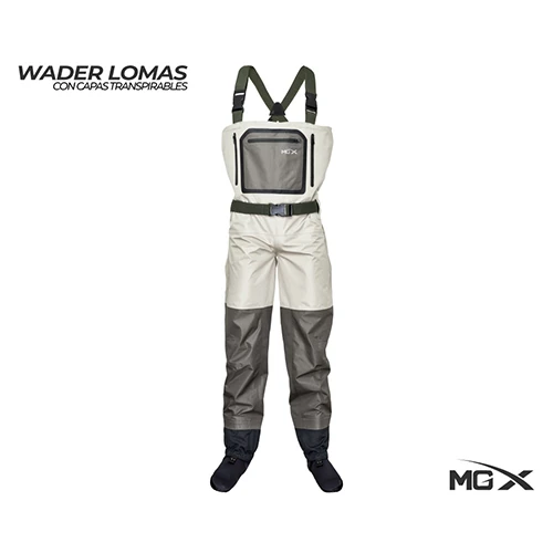 El wader respirable para pesca de MGX está fabricado con 3 capas tela respirable de alta duración (100% Nylon con mebrana PU), medias de neopreno de 4mm y tirantes elásticos con grilletes de liberación rápida.